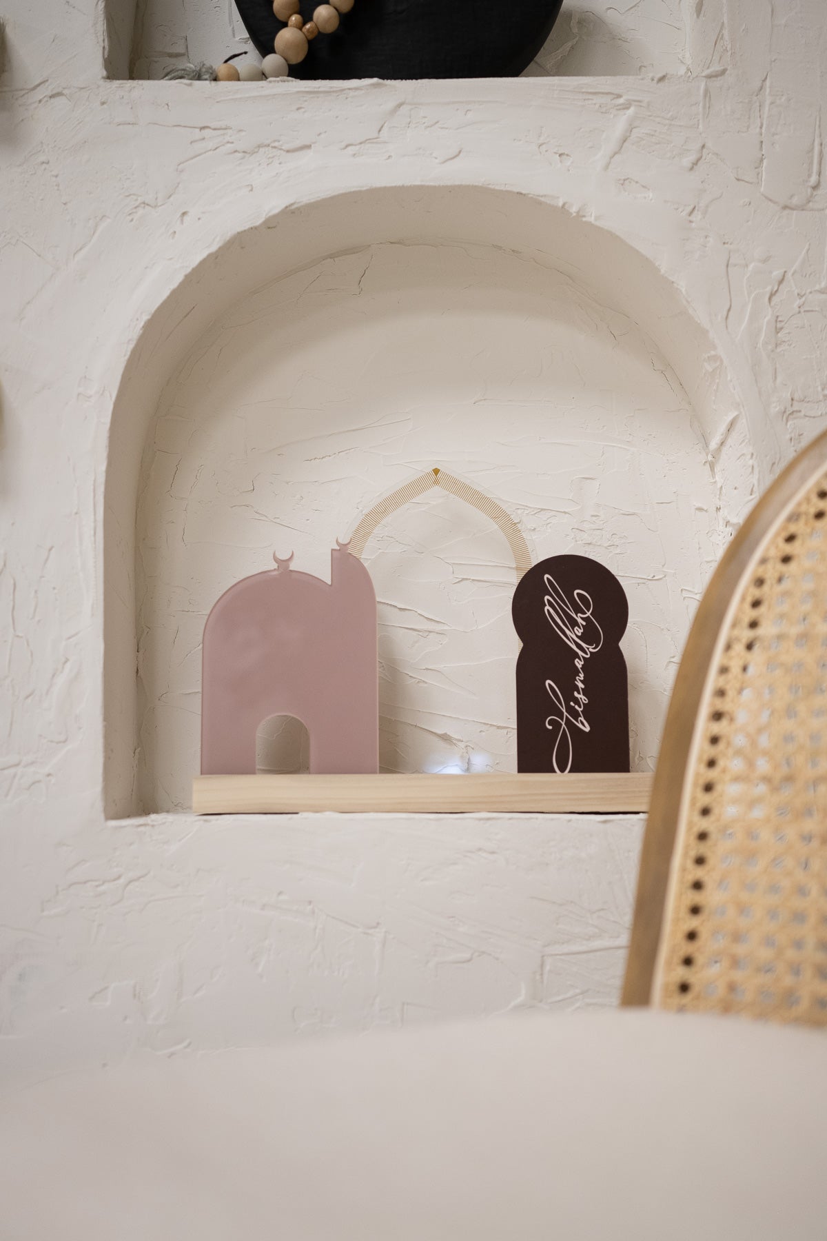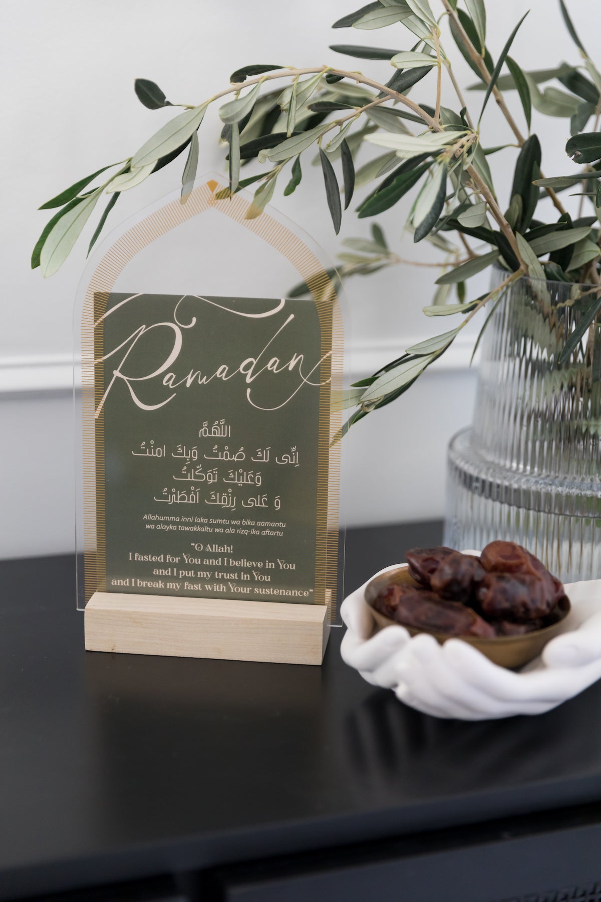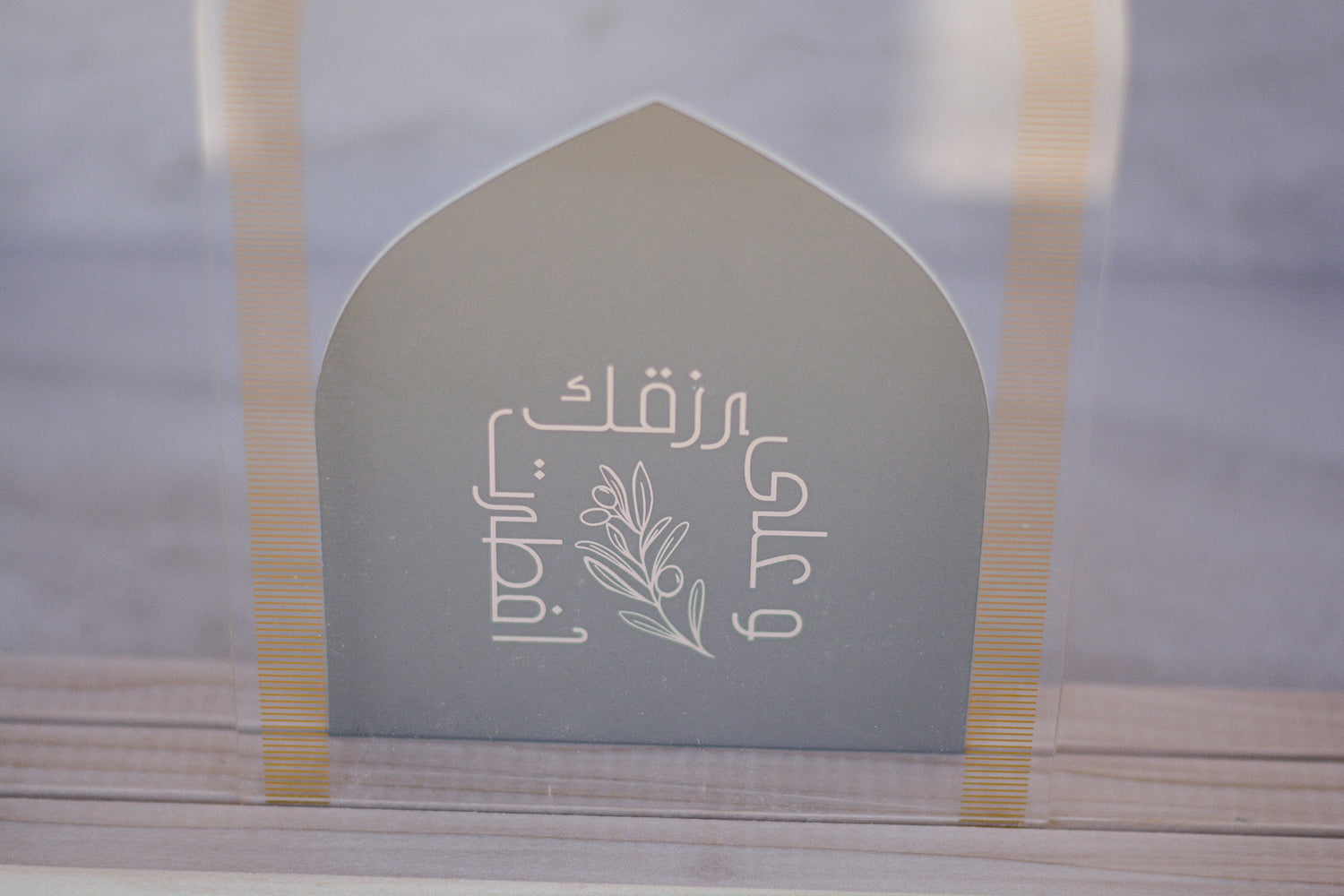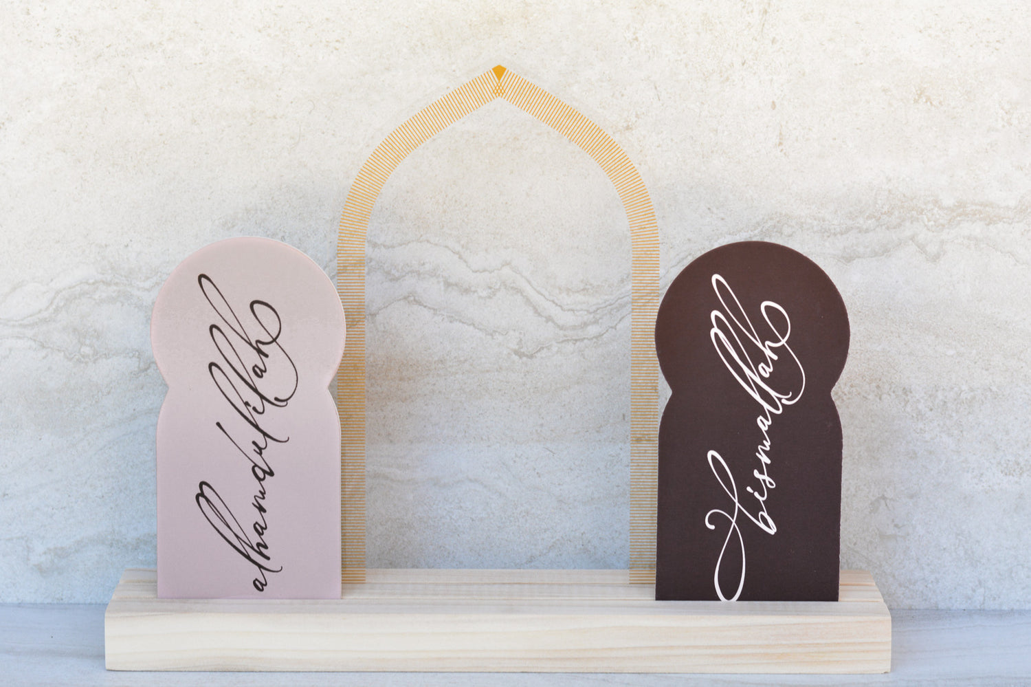 Pair this beautiful Clear Arched Gate Acrylic decor insert with either our large or small wood base set for a beautiful display (bases sold separately). Our largest Luna piece yet, features an elegant pointed arch shape with gold ink details, inspired by Islamic architecture. Try placing in front of another piece for unique display.
