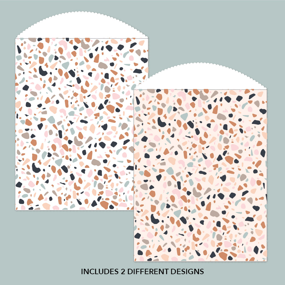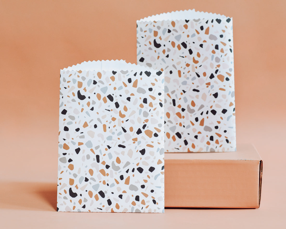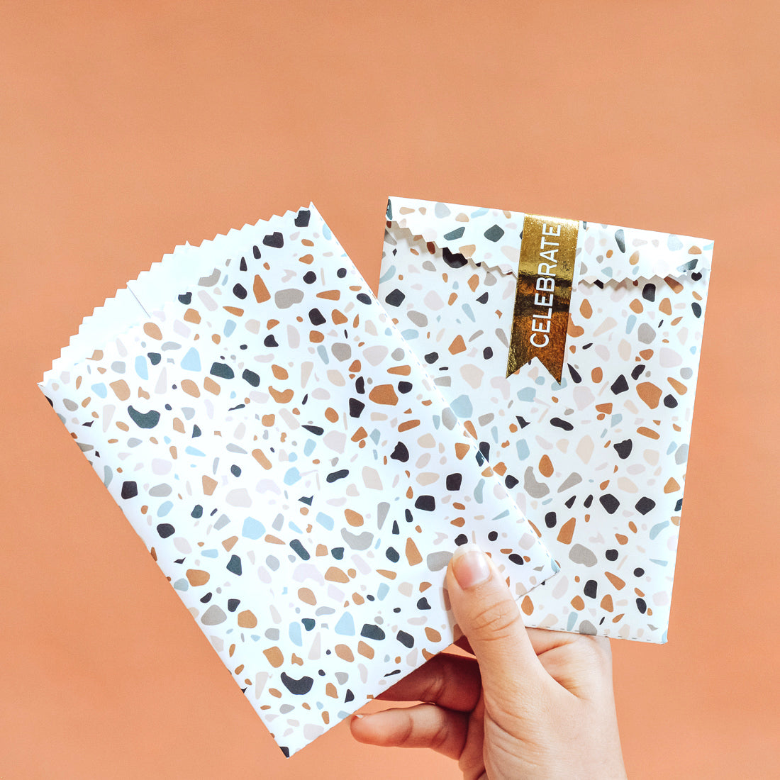 Our Terrazzo collection Gift Bags feature our chic terrazzo stone design on a 4.5"x6" flat favor bag. Perfect for gifting small items, packing up treats or as loot bags for parties.