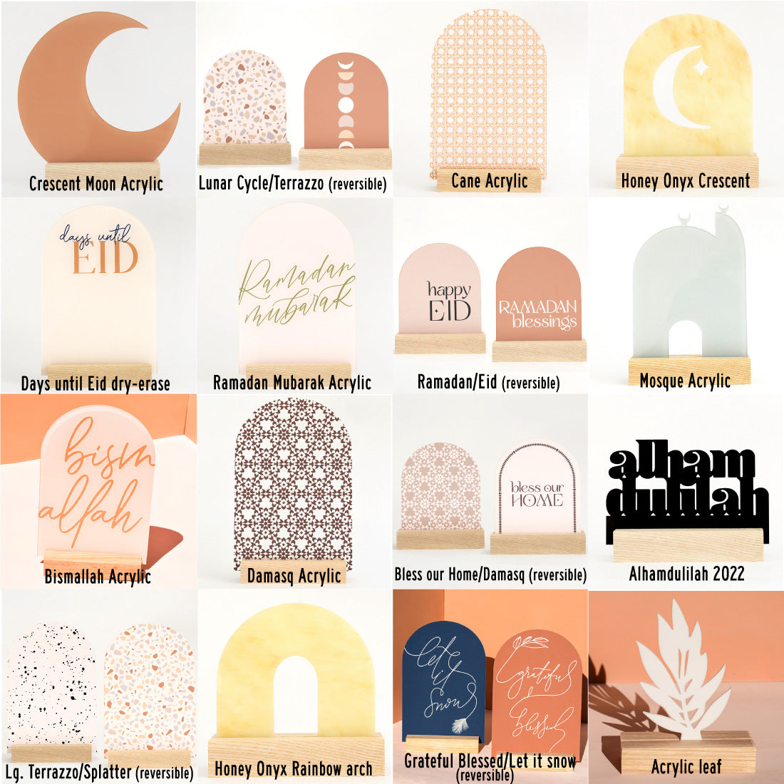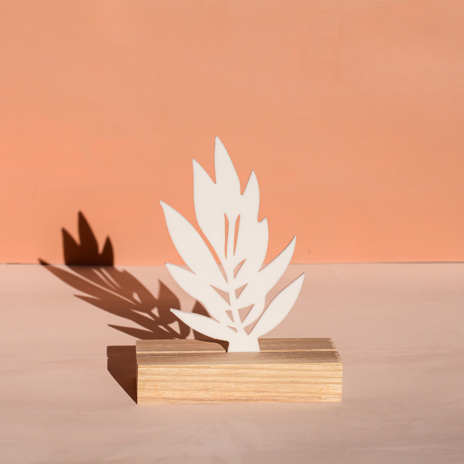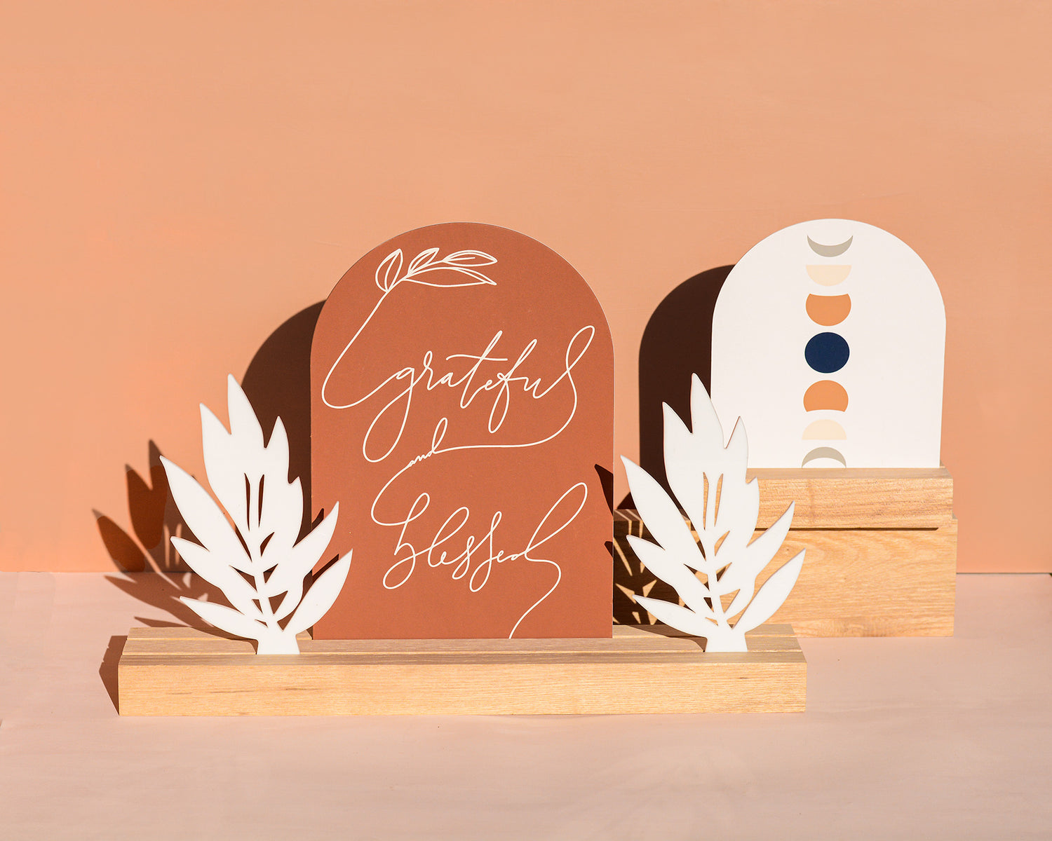 Pair this versatile small acrylic leaf sign with either our large or small wood base set for a beautiful display. Available as part of a set or purchase separately here to add on to your other pieces. This leaf pairs beautifully with our Fall/Winter insert- but can mixed and matched with all our pieces.