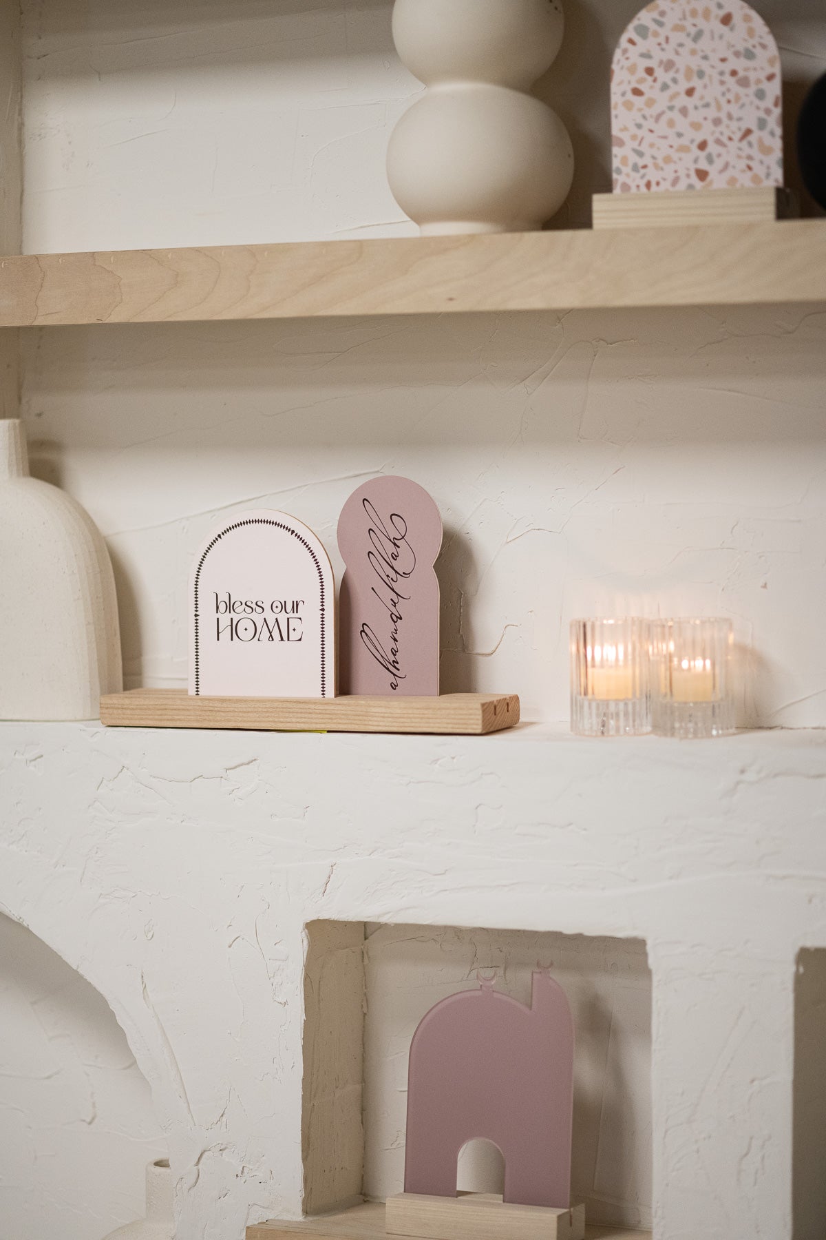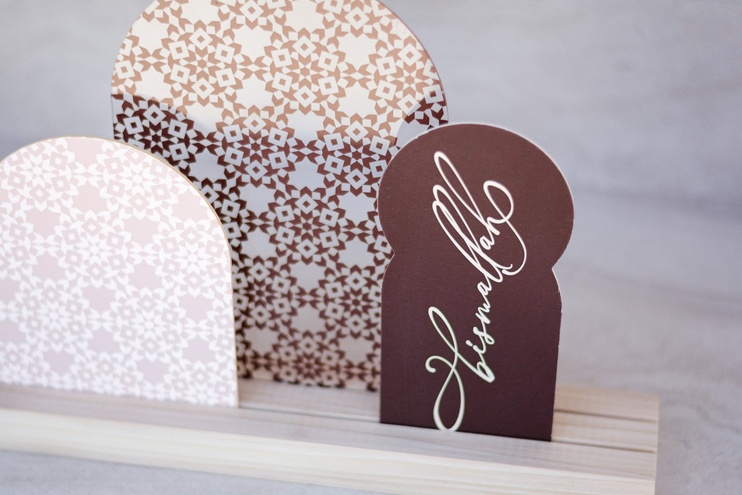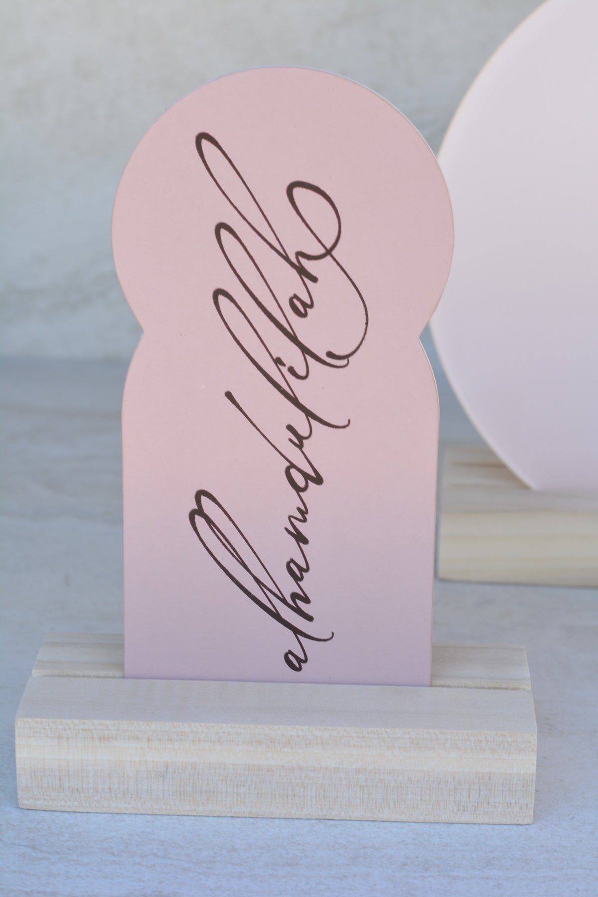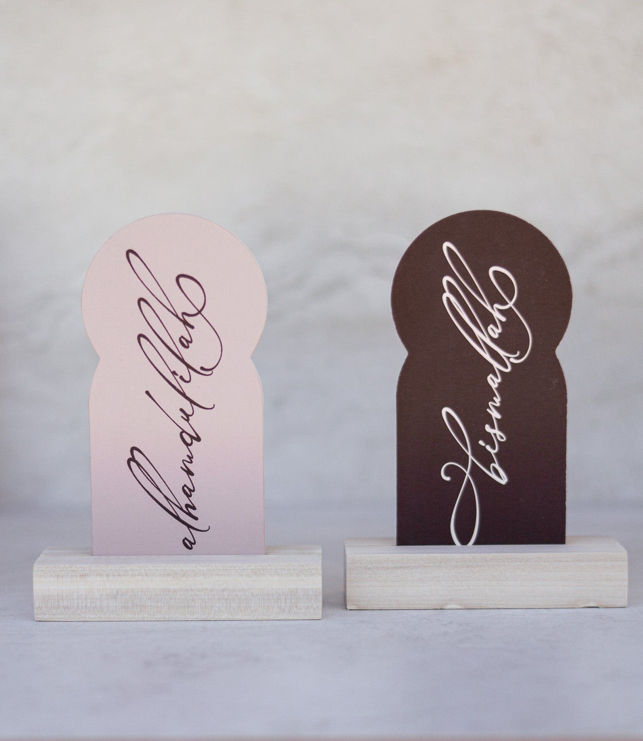 TWO designs in one piece! Pair this versatile small Alhamdulilah & Bismillah reversible insert with either our large or small wood base set for a beautiful display (wood base is sold separately).