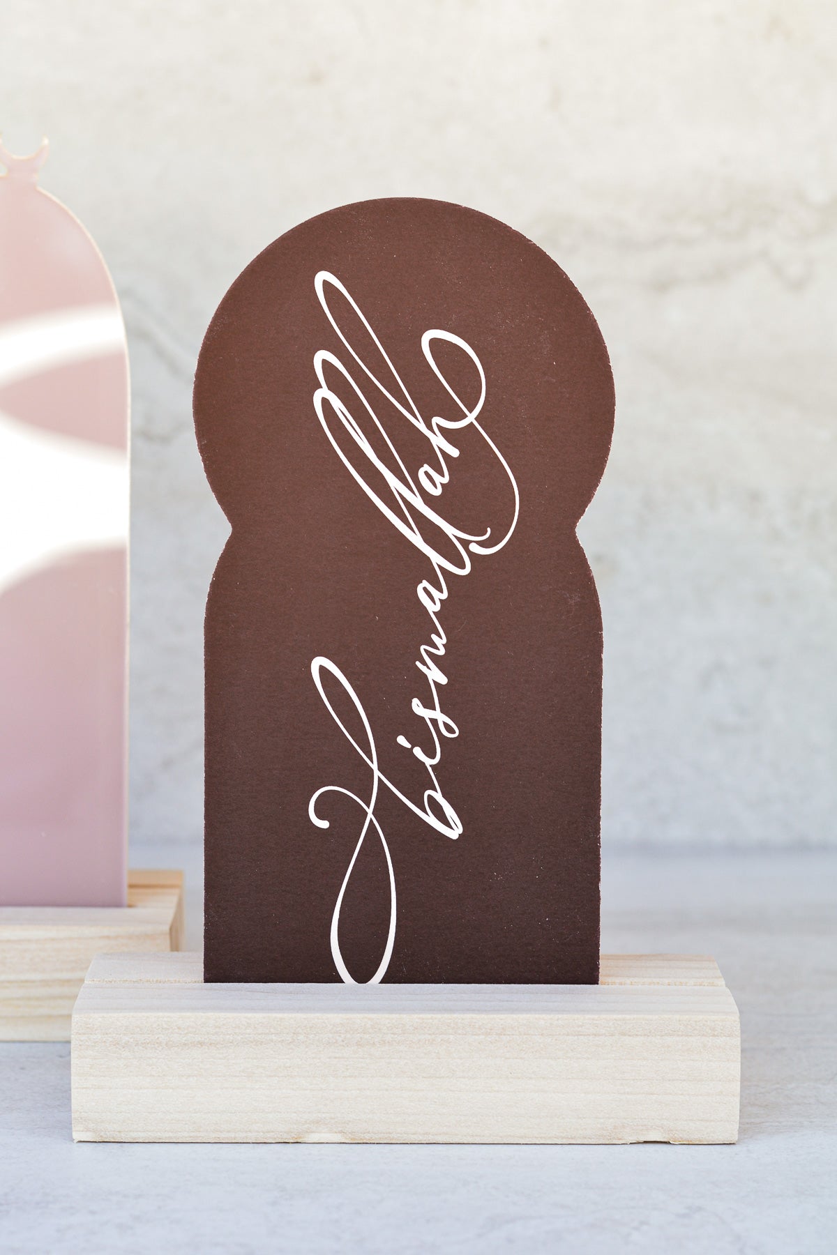 One side features "alhamdulilah" in brown on a taupe background and the other side reads "bismallah" in ivory on a brown background.