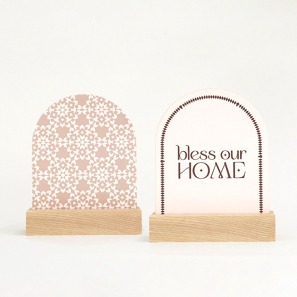 Pair this versatile small Bless Our Home & Damasq decor piece with either our large or small wood base set for a beautiful display. TWO designs in one piece! “Bless our home” in cream on one side and the Damasq print in taupe on the reverse- just flip it to change the look. Coordinates with our Damasq collection too!
