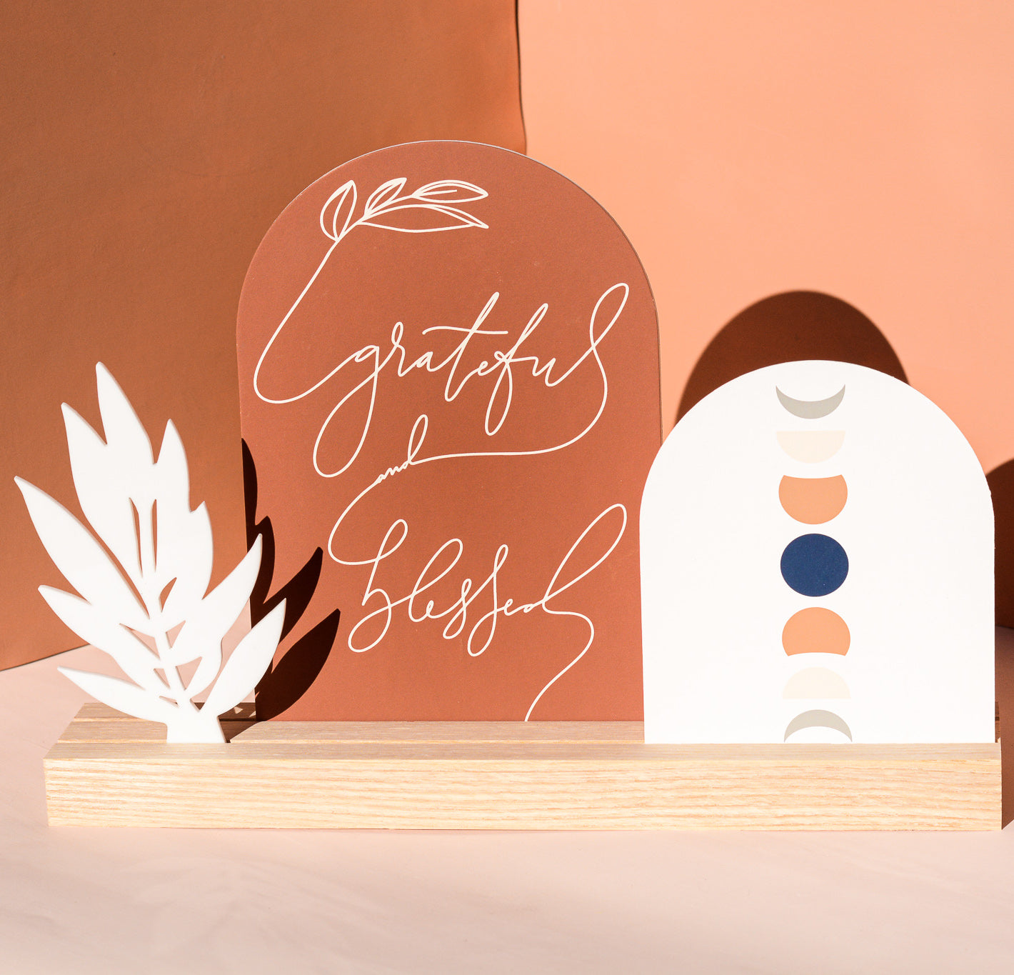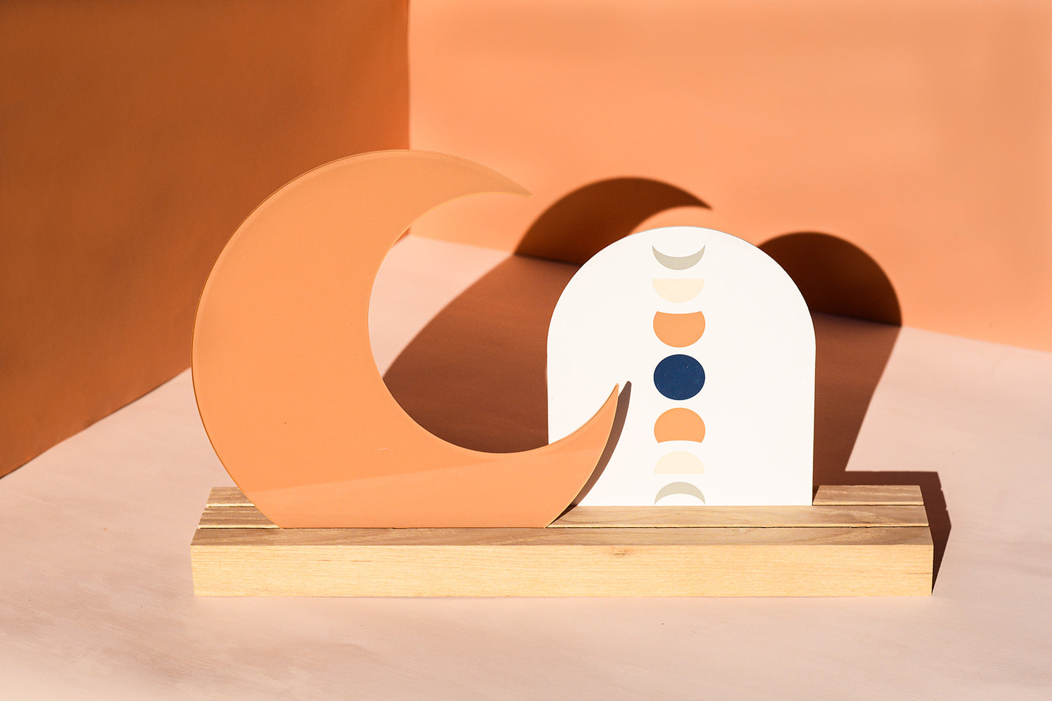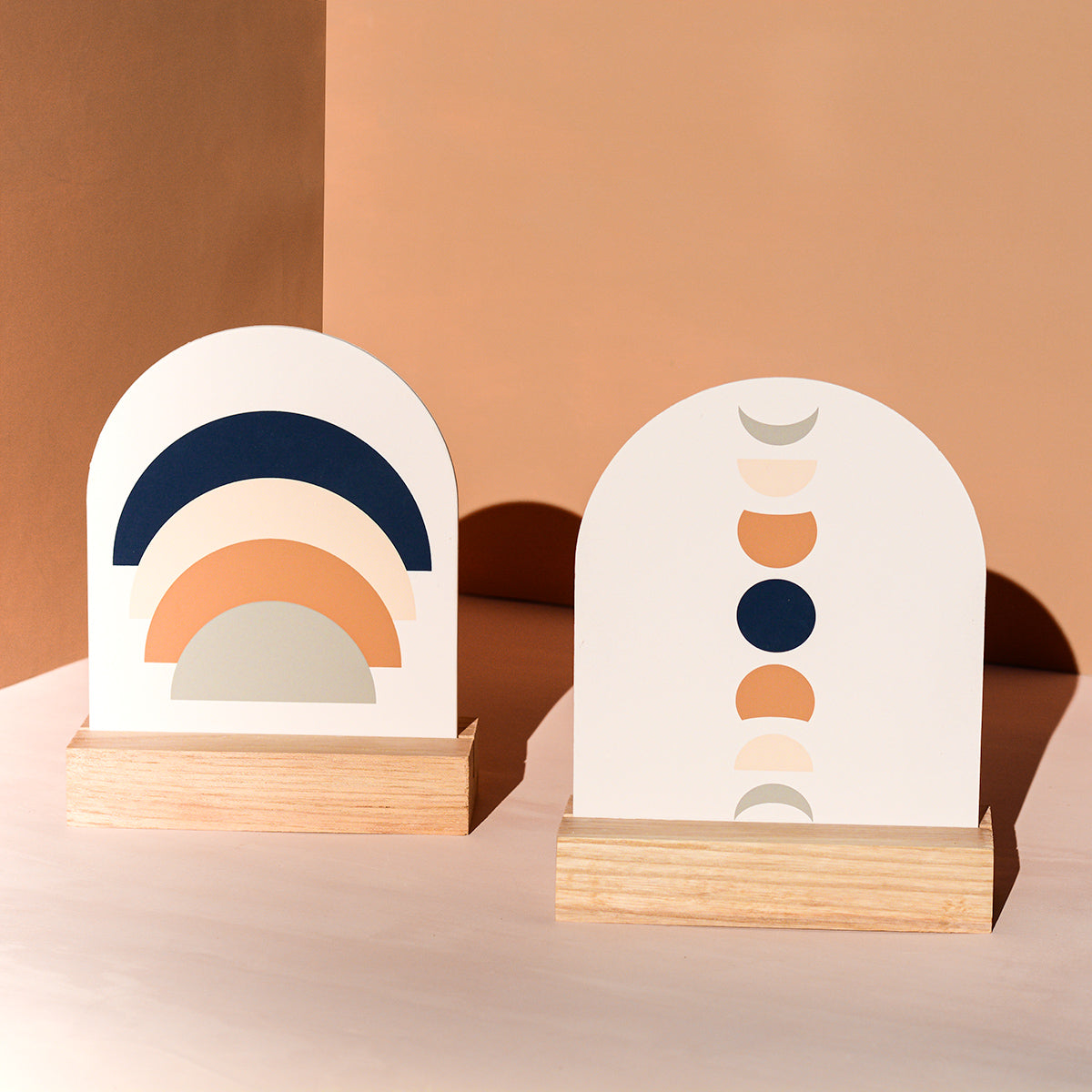 Pair this versatile small Lunar cycle sign with either our large or small wood base set for a beautiful display. The screen printed board is reversible with a modern boho art print on one side and a stylized lunar cycle on the reverse. You can change it around for multiple of looks!