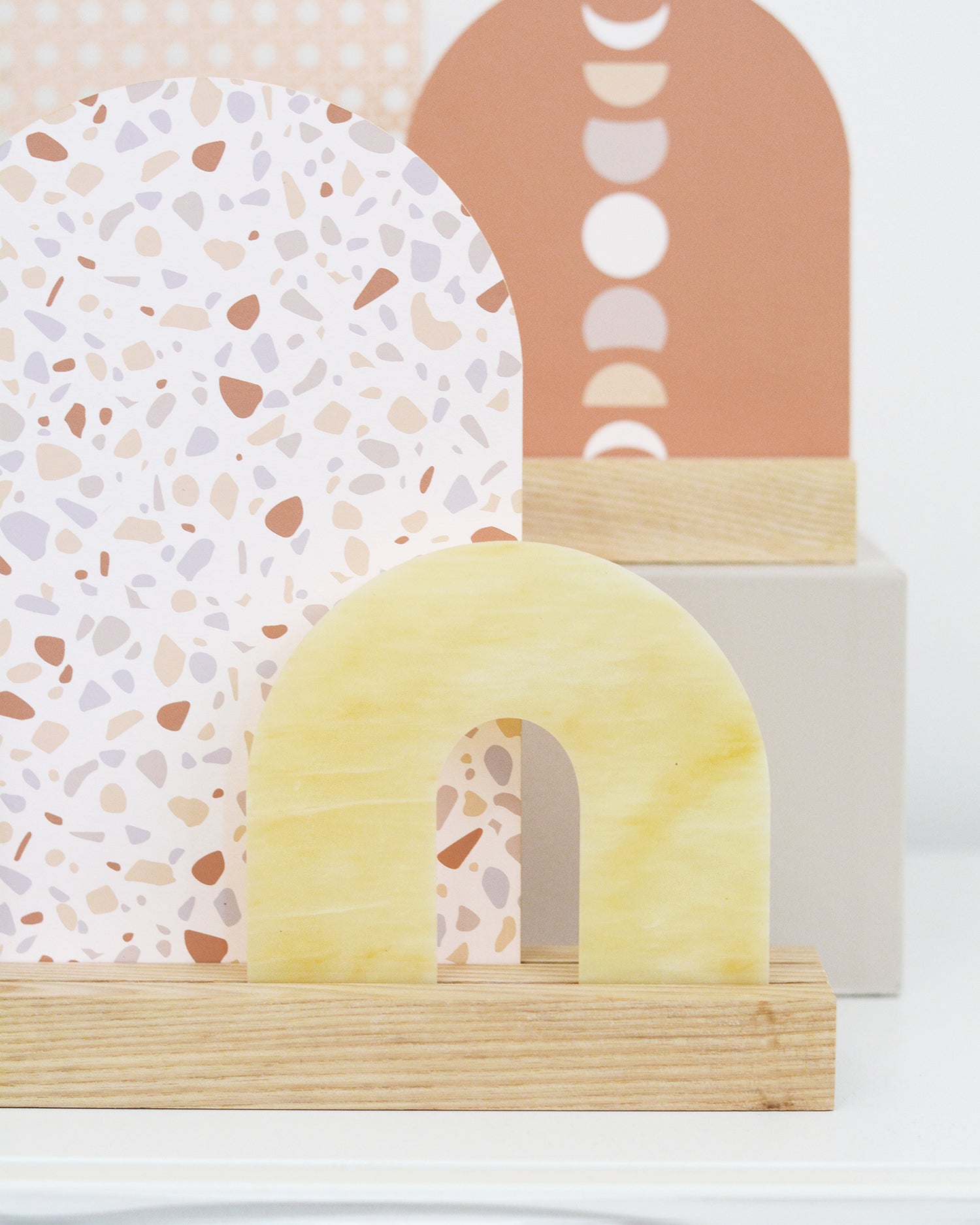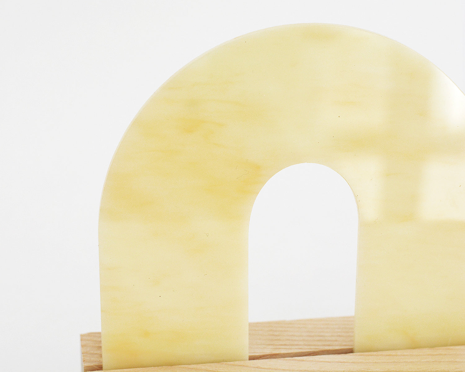 Wait, what do you mean this isn’t really stone?! That’s right this beautiful piece is created out of an acrylic that looks like Honey Onyx stone. Just a hint thicker than our regular acrylic the light honey yellow color of this piece has gorgeous veining throughout to emulate stone and elevate your centerpiece. Pair this versatile rainbow arch piece with either our large or small wood base set for a beautiful display.