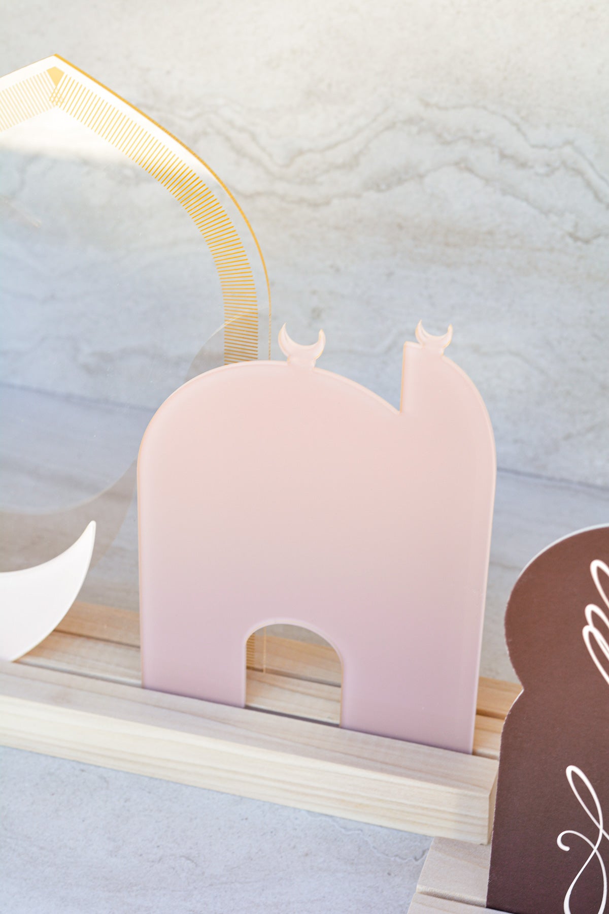 Introducing the Luna Mosque in a new color for 2024! Pair this beautiful acrylic Mosque, now in Taupe, with either our large or small wood base set for a beautiful display. the color is matched to our "happy eid/ramadan" and new "alhamdulilah/bismallah" Luna inserts.