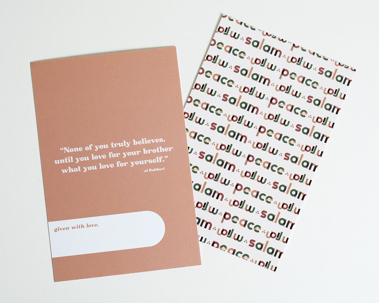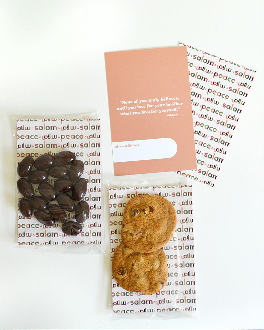 That is the inspiration behind our new Peace & Salam collection. These chic kits feature a glossy backer card with the design on the front to act as a backdrop for treats or small gifts. The backside features a beautiful Hadith reading: “None of you truly believes, until you love for your brother what you love for yourself”, with space to write your name.