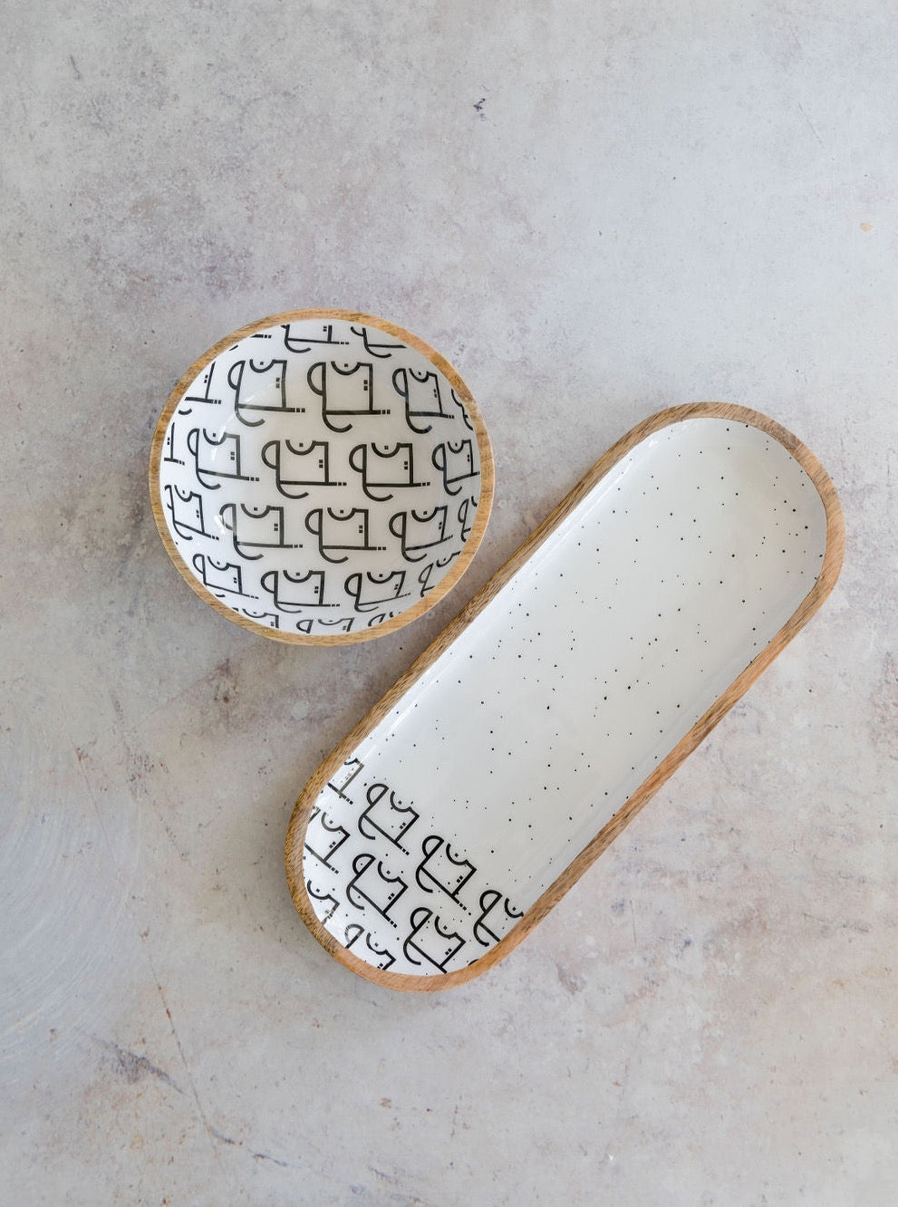 The Sahtein Black Bowl features our exclusive “sahtein” calligraphic motif in chic black and white on a 6” bowl handcrafted from mango wood. The design is finished and sealed with a food-safe enamel coating.