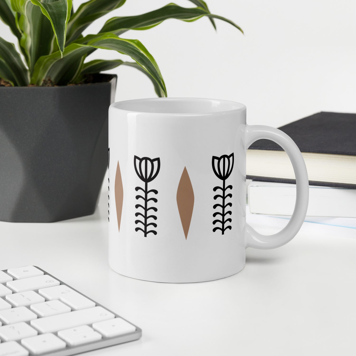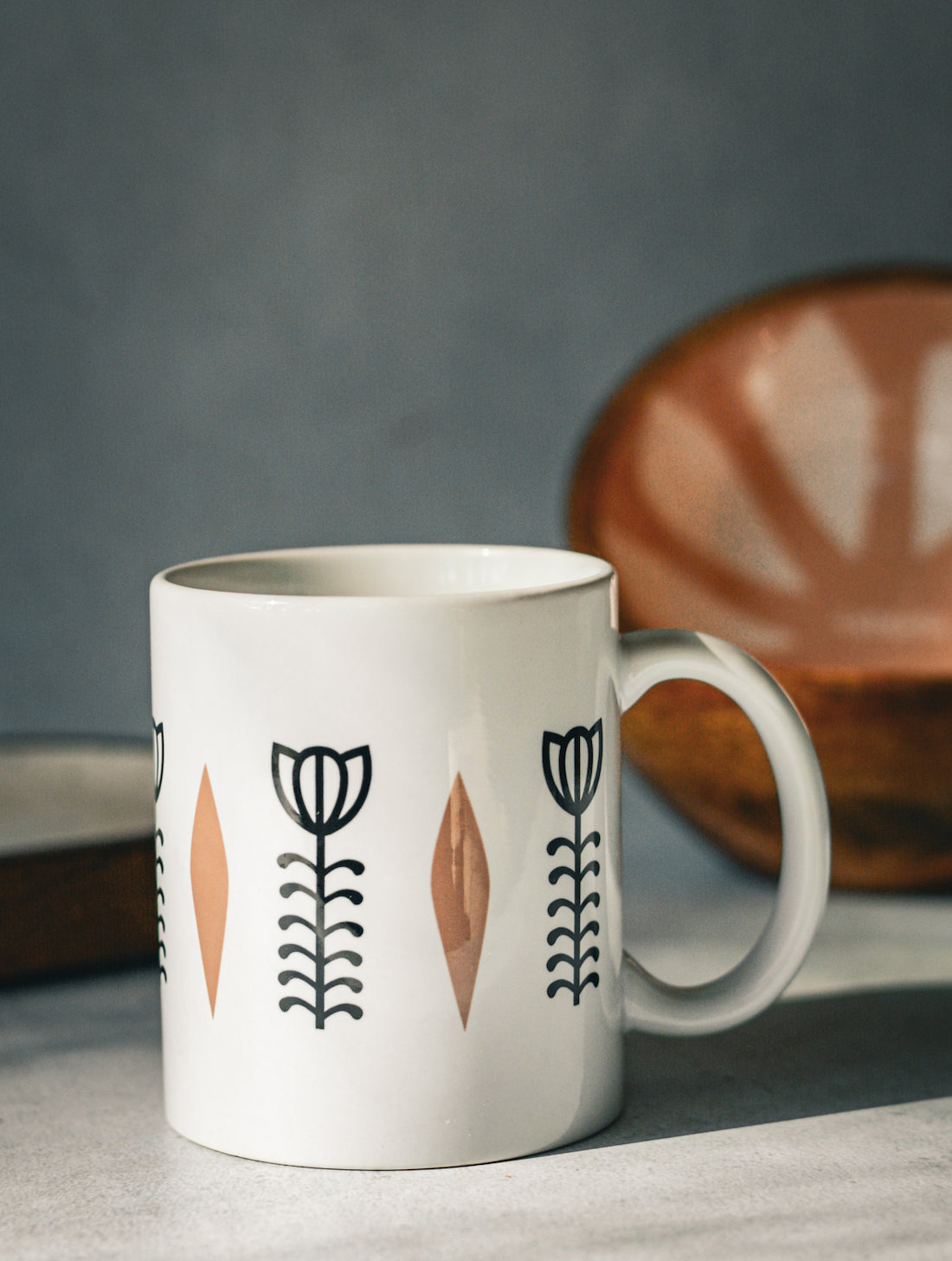 Cue up the nostalgia for traditional Turkish coffee cups of the Levant, or tcrشفة , but in a size worthy of your morning coffee. Traditional cups would hold a sip, but we took the traditional design and re-worked it for your big caffeine fix. Whether you're drinking your morning coffee, evening tea, or something in between—this mug is perfect. It's sturdy and glossy with a vivid print inspired by Lebanese serve ware.